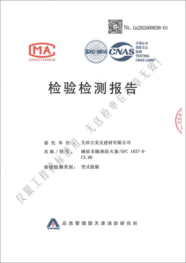 本次檢測由具備CMA/CNAS資質(zhì)的第三方檢測機構(gòu)執(zhí)行,由天津消防研究所出具的報告,是型式檢驗(最高級別的檢驗標(biāo)準(zhǔn))。我公司鋼質(zhì)非隔熱防火窗通過應(yīng)急管理部天津消防研究所C類3.00H防火測試 |